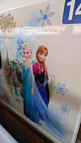 | 東京駅から乗った「こだま715号」は、幸運にもディズニーの「ファンタジースプリングス」の世界観を表現した特別塗装の車両でした。 |