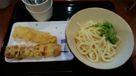 上田市 「うどん天国 麺天」 釜玉うどん、イカ天、ちくわ天 |