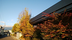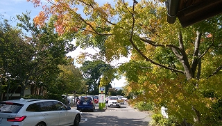 でも、散歩途中にある事業所のもみじが紅葉し始めています。