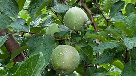 散歩途中の畑のりんごの実も雨に濡れて気持ちよさそうでした。