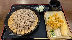そばは「ざるそば(大)」。天ぷらは「イカ天」と「エビ天」と思っていたら … 大量のコーンが目にとまり「エビ天」はやめて「夏のかき揚げ」にしました。 |
