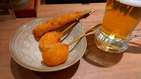 静岡市 「おらが蕎麦(アスティ静岡店)」 串揚げ3種盛、お得ジョッキ、ざるとろろそば、翠 |