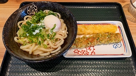 長野市 「はなまる(長野大豆島店)」 温玉ぶっかけ(中)、ちくわ天、いか天 |