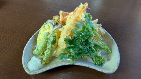 「天ぷら盛合わせ」も注文しました。プロが揚げた揚げたての天ぷらもとても美味しかったです。ちなみに写真は二人前です。 |